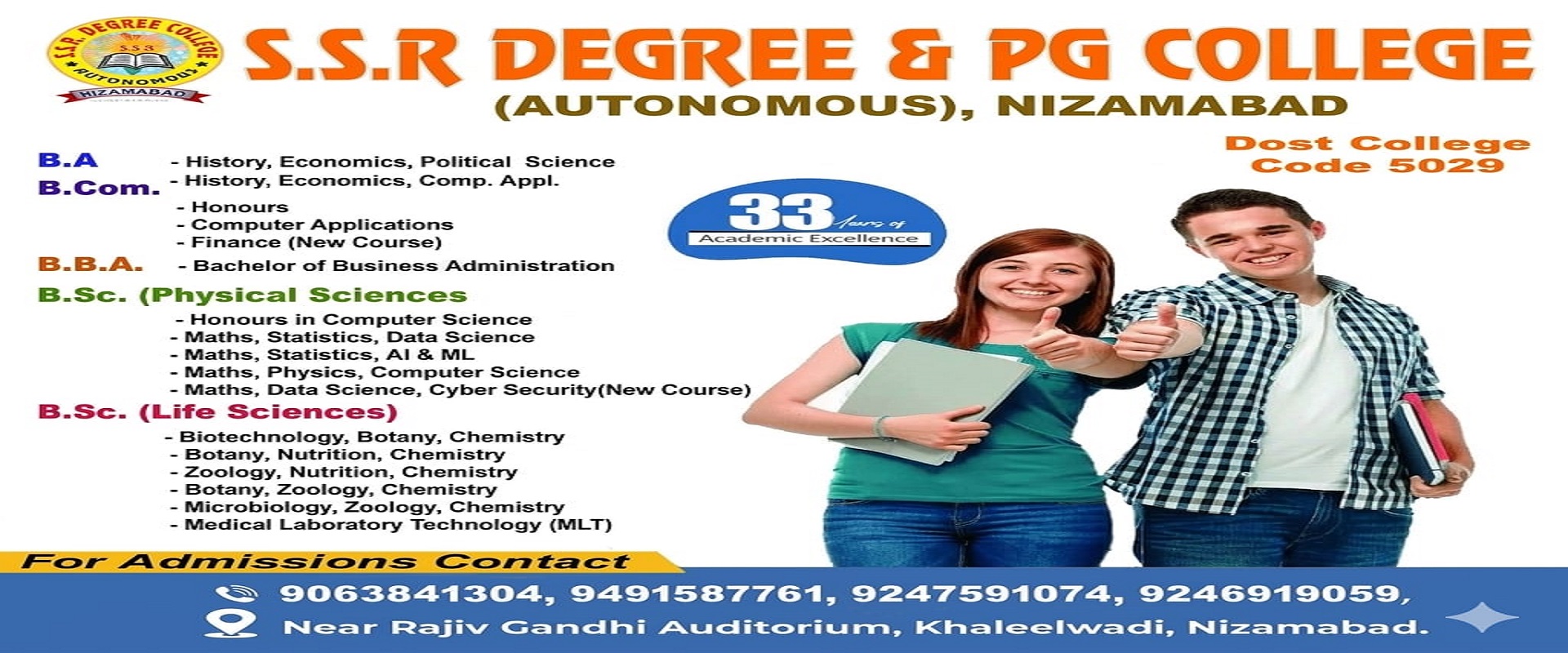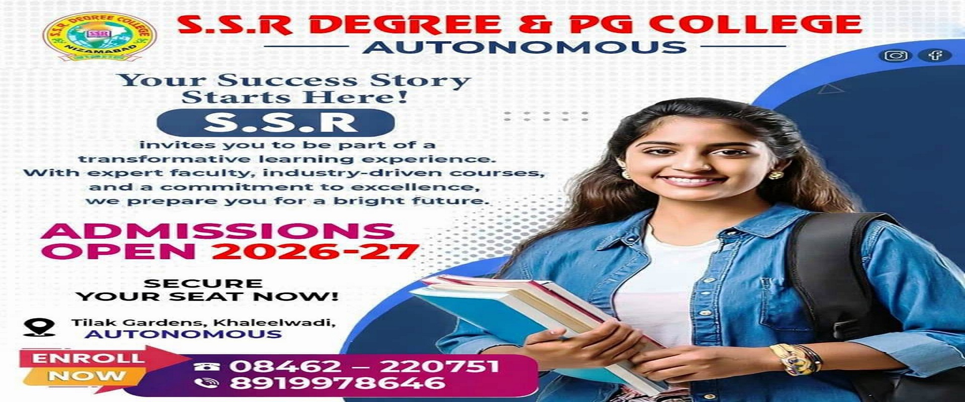 S.S.R. Degree College is one of the top most college in Telangana Region. It is located at heart of the city, near to bus stand and railway station and easily accessible from all corners of the city.
