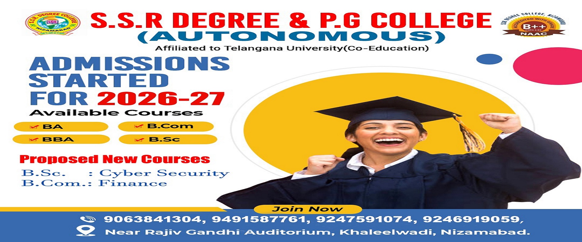 SSR Degree & PG College is affiliated to Telangana UNIVERSITY from 1993-2009 and from 2010 onwards it is affiliated to Telangana University and SSR Junior College is recognized by the